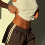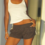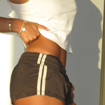 The LIORA Short redefines sport-luxe with a sleek, elevated edge. Cut in a rich brown and finished with a pastel yellow side stripe, LIORA is designed with folding in mind, the stripe continuing seamlessly beneath the waistband for a clean finish. The flattering silhouette is balanced by a soft, stretchy waistband that moves effortlessly with the body while maintaining a polished look. Whilst the waistband is stretchy in itself, the added support of the drawstring helps to ensure a nice fit. Whether styled with a crisp tee, a fitted tank, or over a bikini, the LIORA Short delivers comfort, confidence, and understated cool. The perfect throw on piece for your wardrobe.